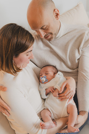 Durante la sesión, me enfoco en crear una atmósfera relajada, en la que los padres y el bebé puedan ser ellos mismos. Esto resulta en fotos que reflejan el amor auténtico y el vínculo familiar, sin poses artificiales ni sonrisas forzadas.